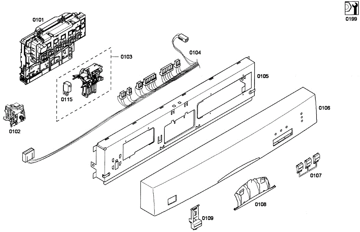 Front-facing control panel facia for dishwashers. Houses buttons and digital display. Replace if cracked, broken, or attachment points are damaged.