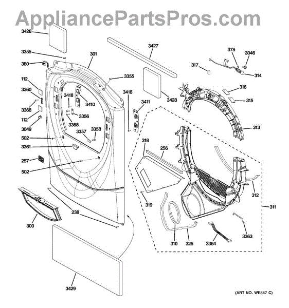 Seals the gap between the dryer drum and front panel to retain heat and reduce friction. Replace if worn, torn, or causing the drum to slip out of place.