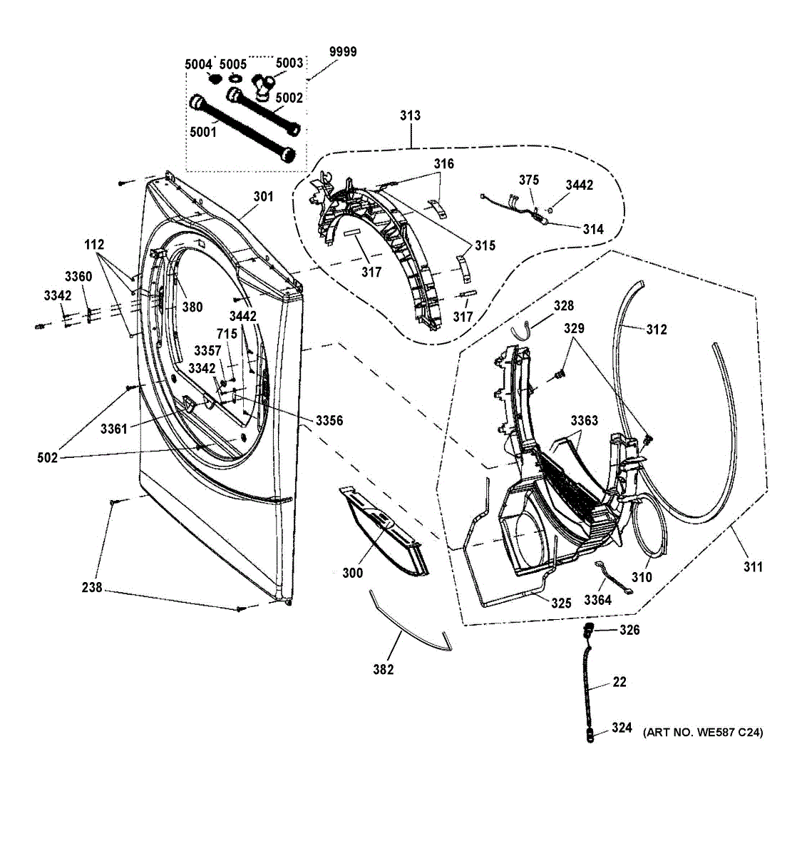 Seals the gap between the drum and front panel to prevent air leaks and noise. Replace if worn, damaged, or causing squeaking sounds. Verify fit with your model.