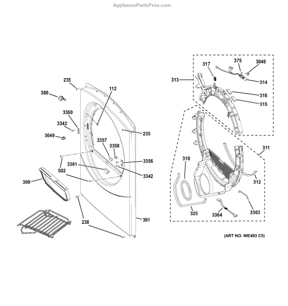 The Bearing Slide Assembly is an OEM component for GE electric clothes dryers. As an integral part of the dryer tumbler system, this assembly includes the bearing slides that allow smooth rotation of the tumbler drum during drying cycles. Symptoms of faulty bearing slides include:
