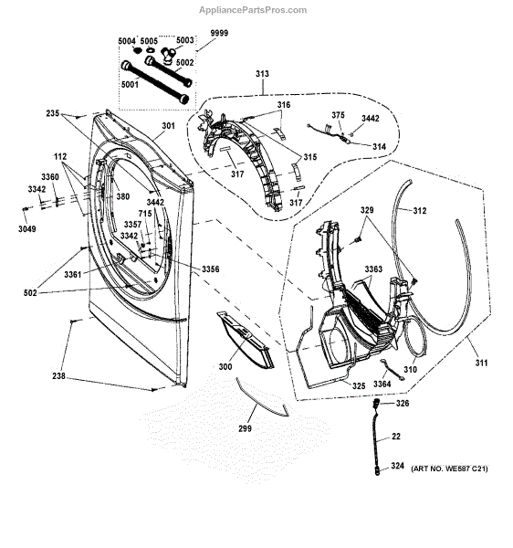 The Trap Duct Assembly is an OEM part for GE dryers. This part directs the airflow from the dryer drum to the exhaust vent. This assembly ensures efficient drying by guiding hot air out of the dryer while collecting lint and debris in the trap, preventing it from clogging the venting system.