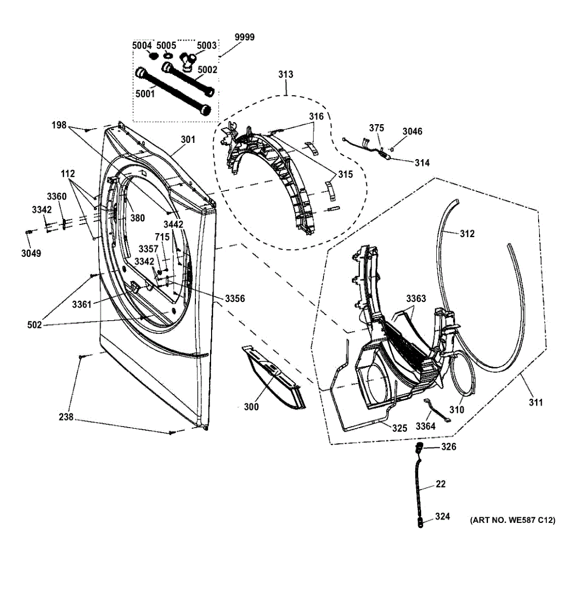 Seals the gap between the drum and front panel to prevent air leaks and noise. Replace if worn, damaged, or causing squeaking sounds. Verify fit with your model.