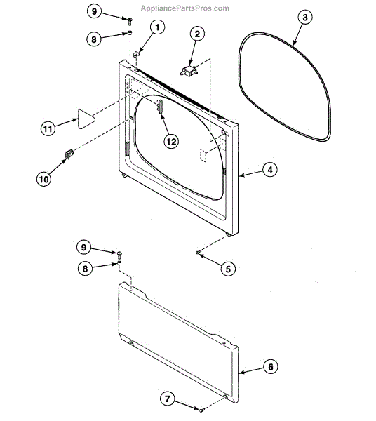 This door catch assembly secures the door when closed so the machine can run. A worn or broken catch can keep the door from latching firmly, causing start issues or interruptions during a cycle.
