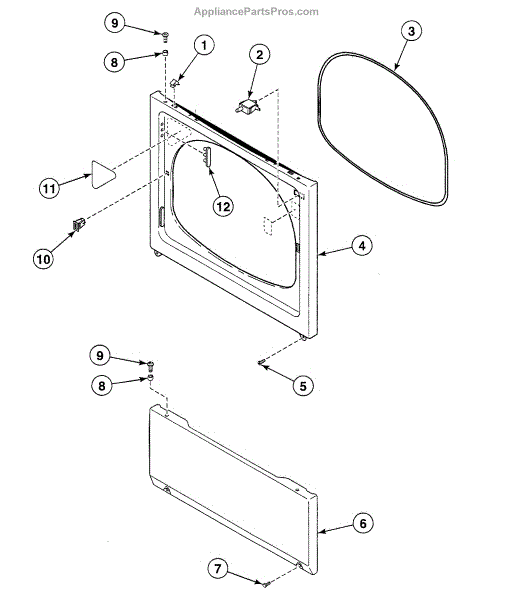 This door catch assembly secures the door when closed so the machine can run. A worn or broken catch can keep the door from latching firmly, causing start issues or interruptions during a cycle.