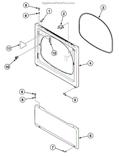 This door catch assembly secures the door when closed so the machine can run. A worn or broken catch can keep the door from latching firmly, causing start issues or interruptions during a cycle.