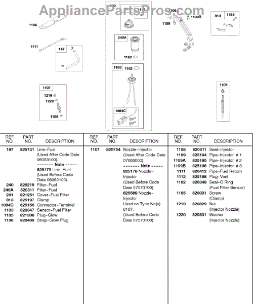 Parts for Briggs & Stratton 522447-0108-E2: Fuel Filter, Injector Pipes, Glow Plugs Parts