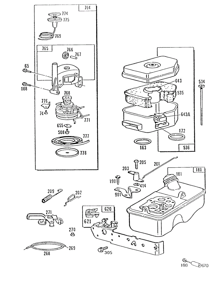 Parts for Briggs & Stratton 094908-0631-01: Fuel Tank, A / C,Vertical Pull Parts