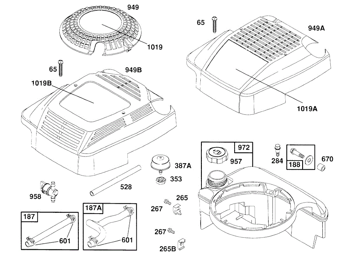 Parts for Briggs & Stratton 123807-0431-99: Fuel Tank Assy,Covers, Hoses Parts