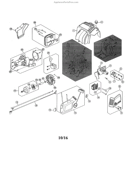 Flywheel assembly for gas leaf blowers and line trimmers. Mounts to the engine crankshaft. Replace if cracked, damaged, or missing flywheel fins.