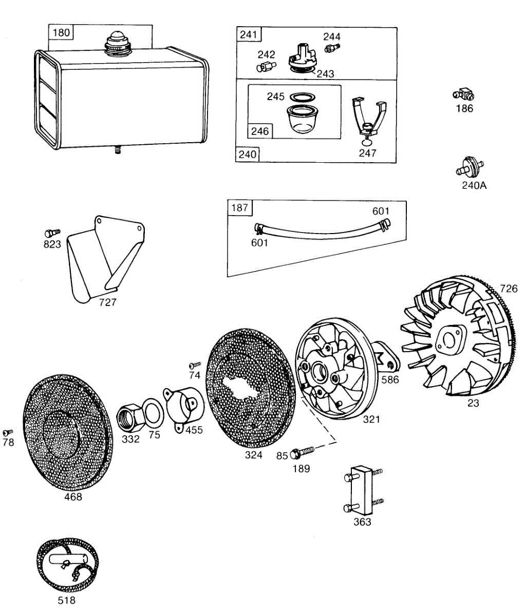 Parts for Briggs & Stratton 401415-0152-99: Fuel Tank,Flywheel,Screens Parts