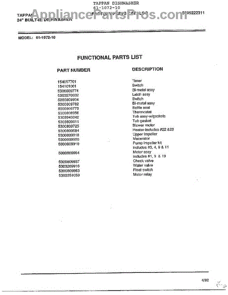 Parts for Frigidaire 61-1072-10: Functional Parts