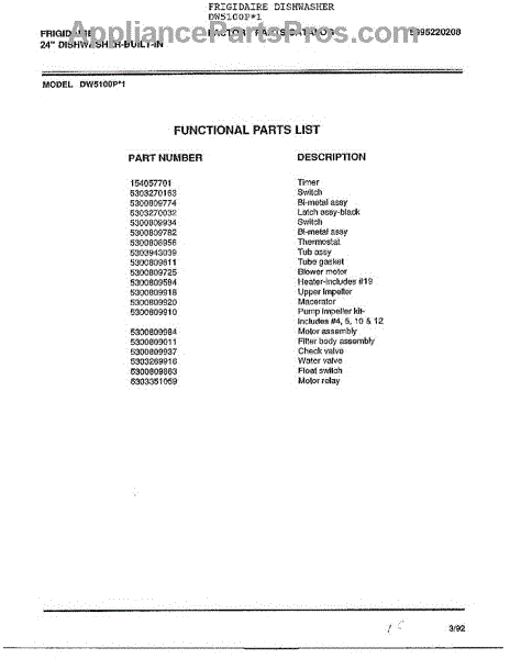 Parts for Frigidaire DW5100P*1: Functional Parts