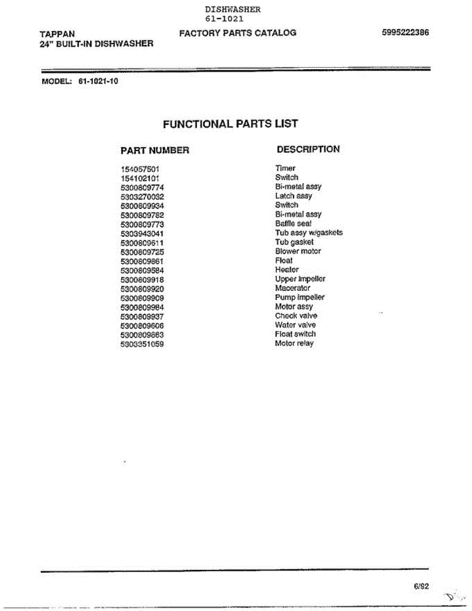 Parts for Tappan 61-1021: Functional Parts
