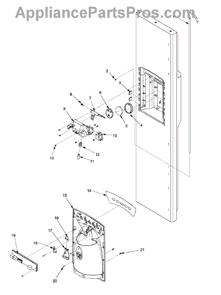 Replaces broken or cracked ice chute door on side-by-side refrigerators. Snaps onto dispenser assembly. Common issues: broken clips, cracked hinge.