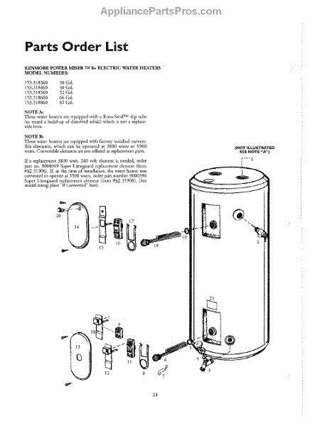 Parts for Kenmore 153.318460 (153318460, 153 318460): 40 Gallon Model Parts