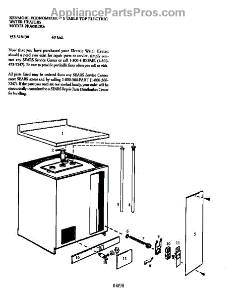 Parts for Kenmore 153.318130 (153318130, 153 318130): 40 Gallon Table Top Parts