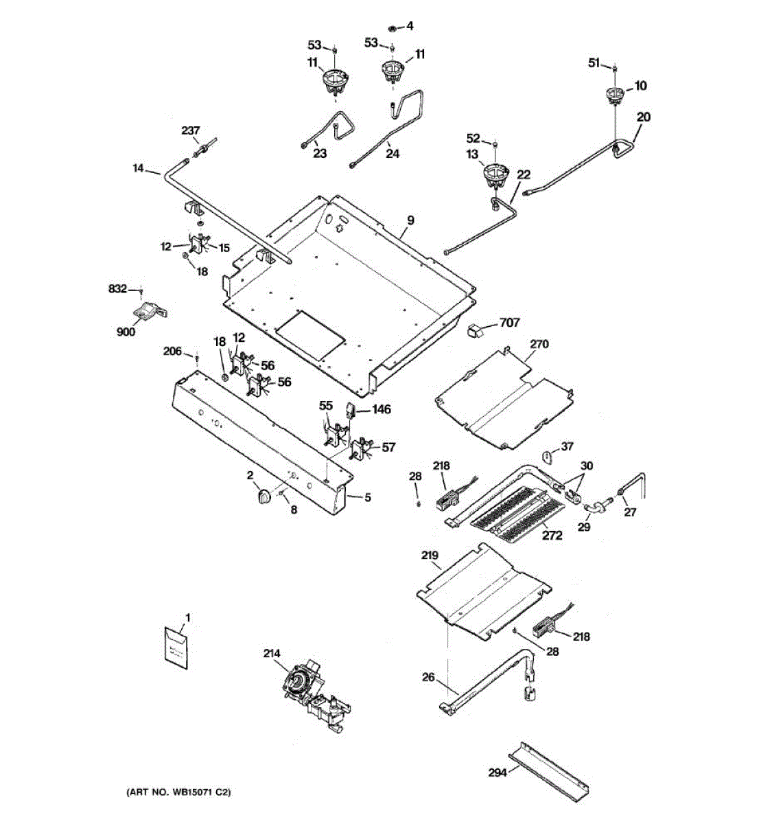 Burner box for gas ranges. Installs beneath the cooktop to house burner components. Replace if cracked, warped, rusted, or damaged from heat exposure.
