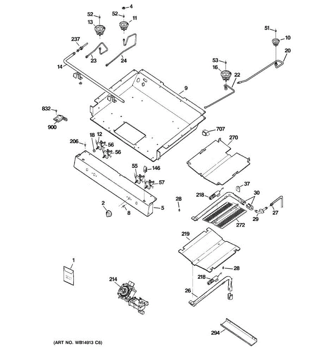 Burner box for gas ranges. Installs beneath the cooktop to house burner components. Replace if cracked, warped, rusted, or damaged from heat exposure.