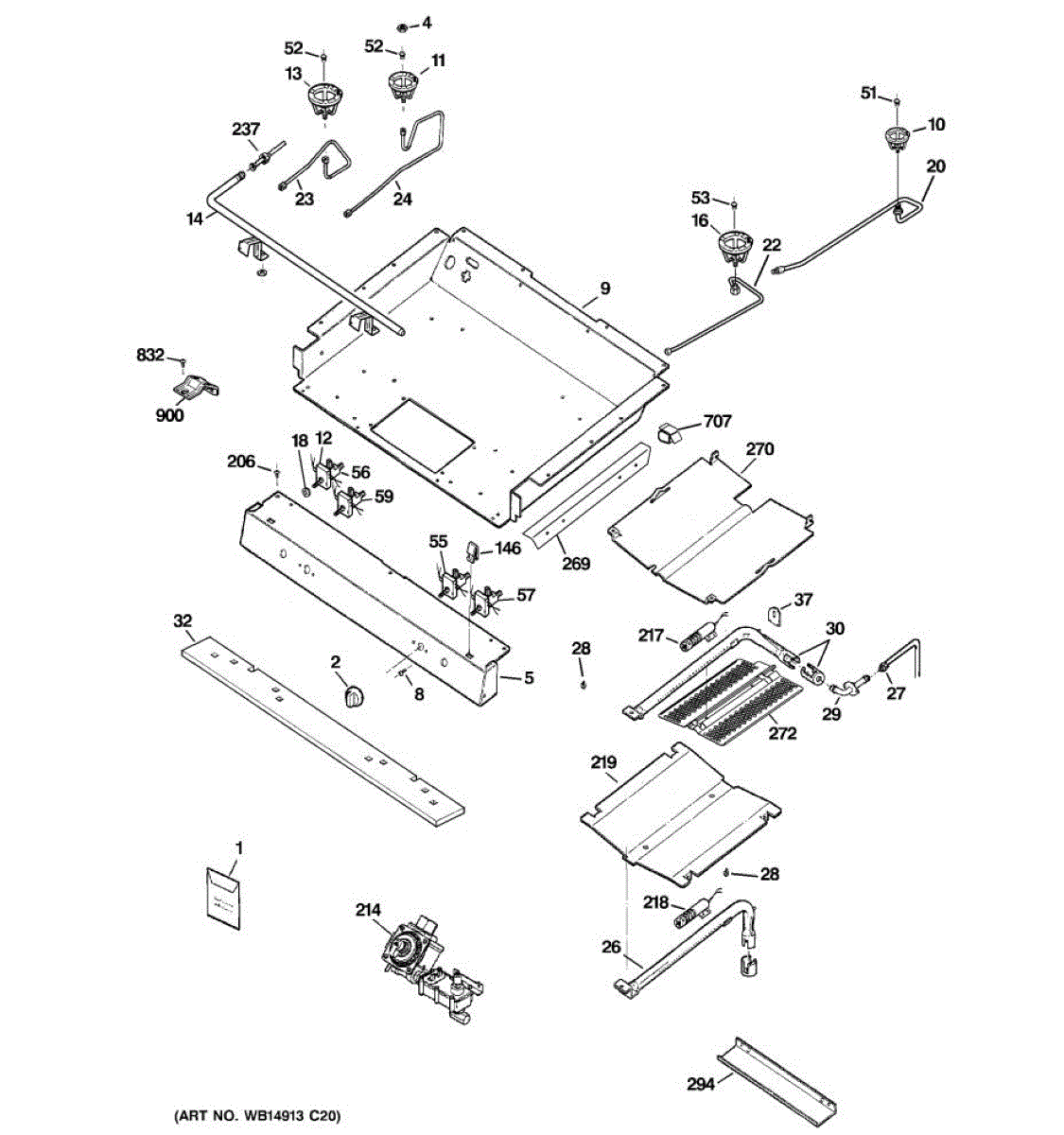 Burner box for gas ranges. Installs beneath the cooktop to house burner components. Replace if cracked, warped, rusted, or damaged from heat exposure.