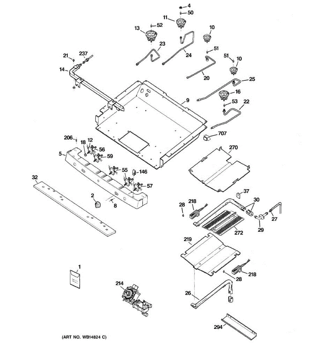 Burner box for gas ranges. Installs beneath the cooktop to house burner components. Replace if cracked, warped, rusted, or damaged from heat exposure.