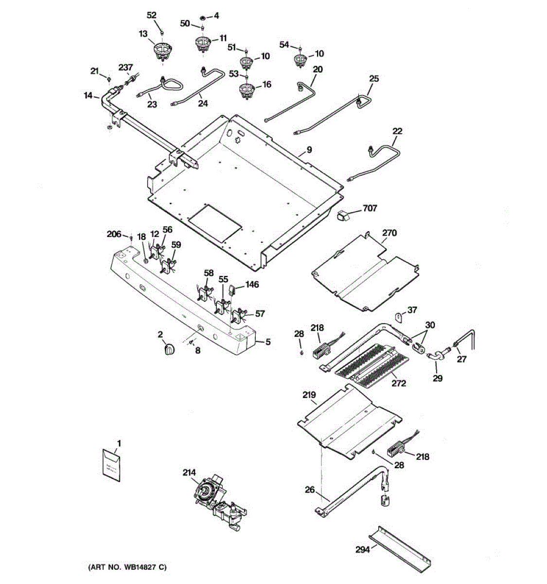 Burner box for gas ranges. Installs beneath the cooktop to house burner components. Replace if cracked, warped, rusted, or damaged from heat exposure.