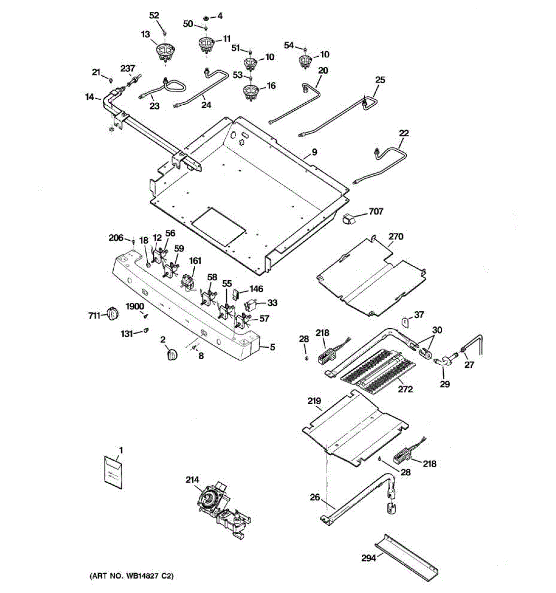 Burner box for gas ranges. Installs beneath the cooktop to house burner components. Replace if cracked, warped, rusted, or damaged from heat exposure.