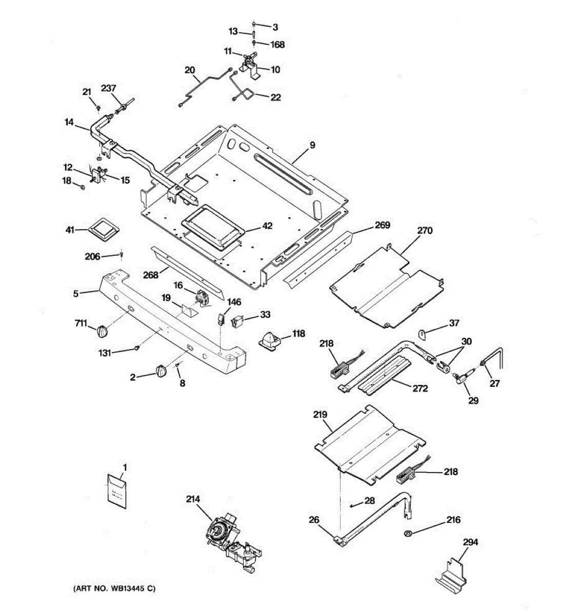 Broil shield for gas ranges. Mounts inside the oven cavity to protect components from direct heat. Replace if cracked, warped, or damaged.