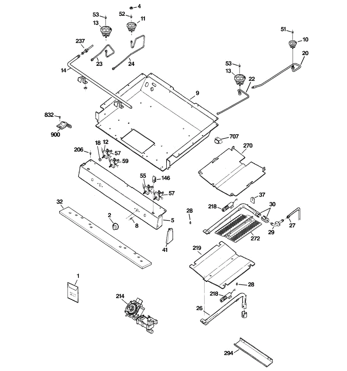 Burner box for gas ranges. Installs beneath the cooktop to house burner components. Replace if cracked, warped, rusted, or damaged from heat exposure.