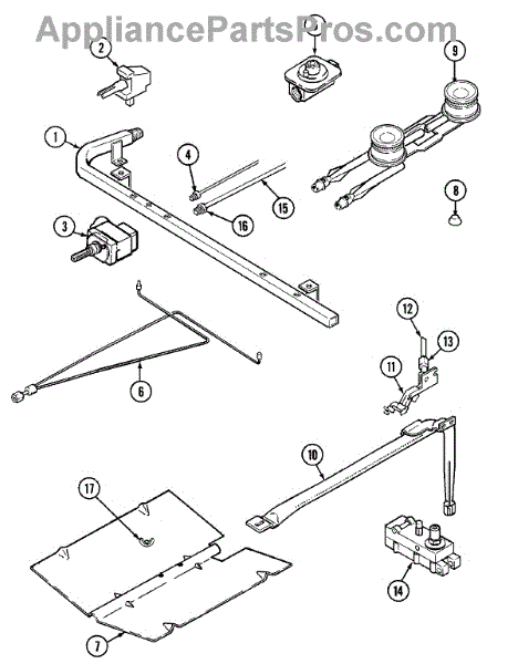 Pilot burner assembly for gas range surface burners. Provides continuous flame for ignition. Replace when pilot won't stay lit, flame is weak, or assembly is damaged.