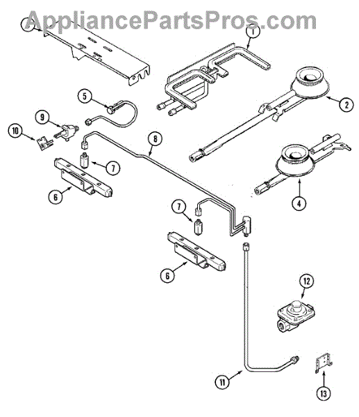 This genuine OEM part is a cooktop grill burner. The grill burner is the component part that allows the gas flame to spark so that the stove can perform its job of cooking and heating. If the stove burners are no longer producing a flame or not turning on at all, it might be time to replace the grill burner. Luckily this is a relatively simple repair.To start, make sure that all power to the stove has been turned off by either unplugging the appliance or shutting off the circuit breaker. Close the shut off valve on the propane gas tank. Remove the cooking grate and the flame tamer from the top of the damaged burner. Pull the cotter pin out of the back of the burner. Remove the burner mounting screws. Pull the burner back then up to remove it from the manifold and remove the burner. Place the new burner into the manifold and fasten the mounting screws. Reinstall the cotter pin and flame tamer and restore the gas and power back to the appliance.This replacement part is sold individually and is compatible with Whirlpool, Maytag, KitchenAid, Jenn-Air, Amana, Magic Chef, Admiral, Norge, Roper, and Sears/Kenmore brand stoves.
