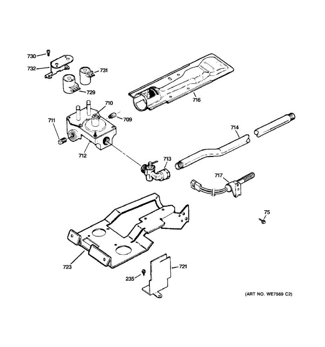 This burner assembly is the combustion head for GE gas dryers. It mixes gas and air and directs a stable flame into the heater housing, restoring consistent heat when the original burner is corroded, warped, or clogged.