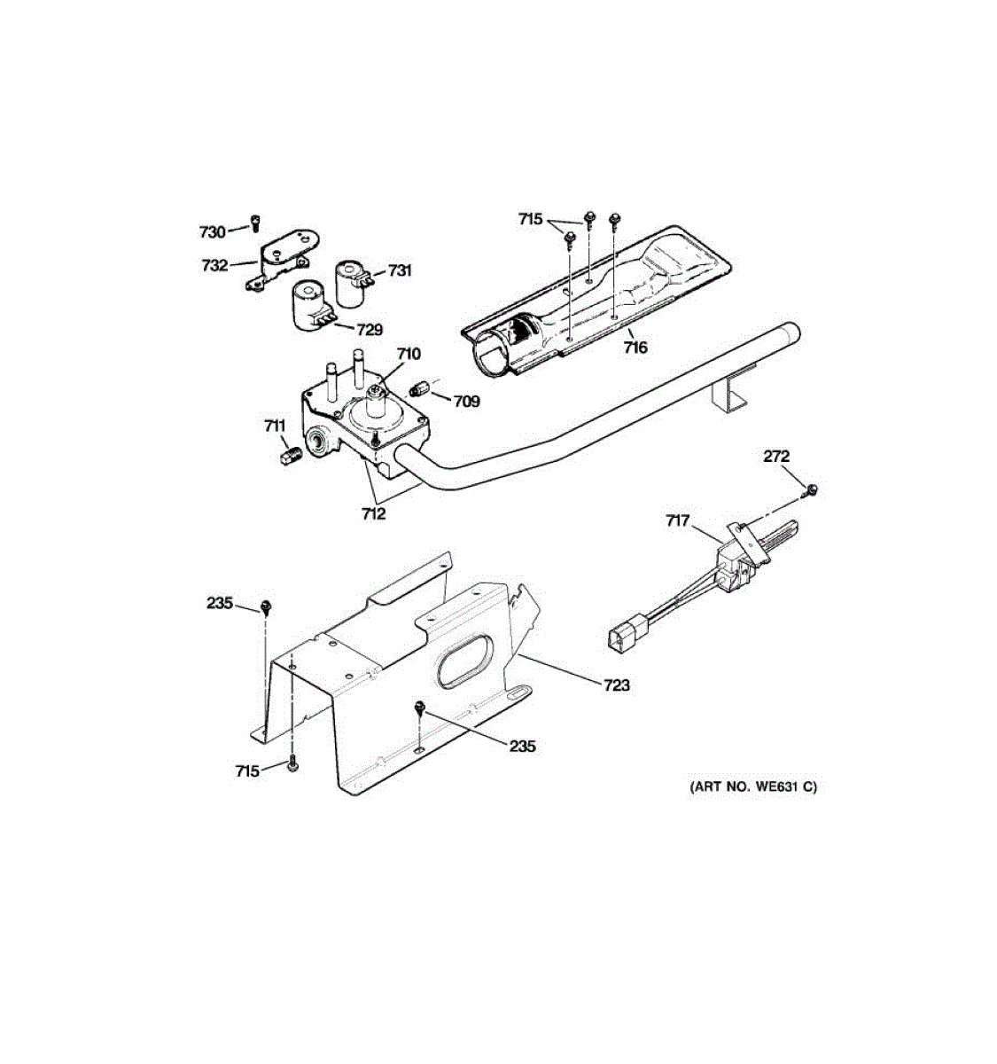 This burner assembly is the combustion head for GE gas dryers. It mixes gas and air and directs a stable flame into the heater housing, restoring consistent heat when the original burner is corroded, warped, or clogged.