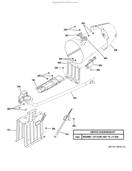 The LP Conversion Kit is an OEM part for GE dryers. This kit allows for the conversion of a natural gas dryer to operate on liquid propane (LP) gas. It includes all necessary components to ensure a safe and efficient conversion process, including a new orifice, regulator spring, and installation instructions.
