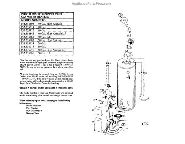 Parts for Kenmore 153.335914 (153335914, 153 335914): Gas Water Heater Parts