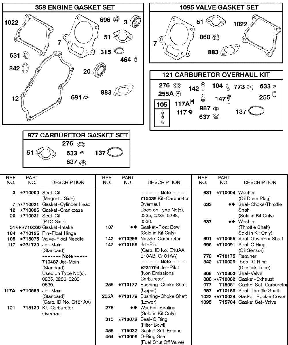 Parts for Briggs & Stratton 115432-0038-01: Gasket Set - Carburetor, Gasket Set - Engine, Gasket Set - Valve, Kit - Carburetor Overhaul Parts