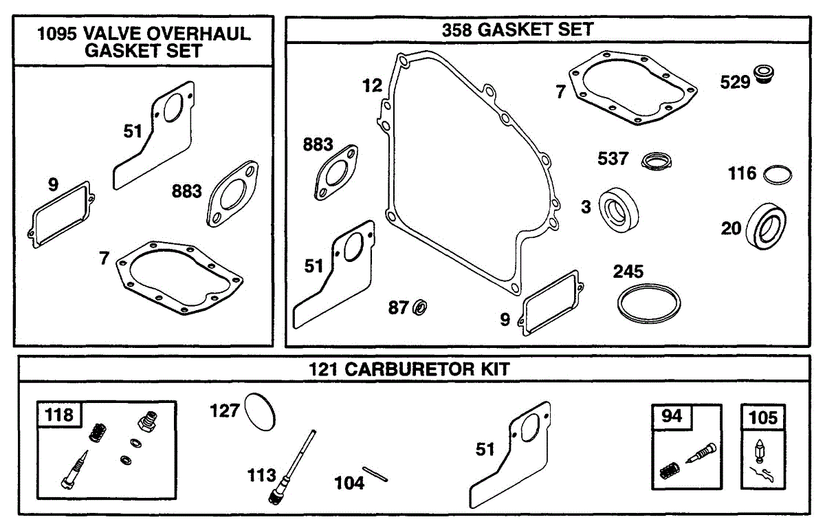 This is an OEM replacement carburetor overhaul kit. It can be used with select models of lawn and garden equipment engines. The carburetor is one of the most important parts of the engine. It is responsible for creating and circulating the air/fuel mixture that is used to initiate combustion in the engine. Over time, the carburetor's gaskets and parts can become worn, damaged, or brittle due to age, constant heat and vibrations, and exposure to chemicals in fuel. It is easy and more affordable to rebuild and replace gaskets than to buy a new unit. This genuine OEM carburetor overhaul kit is manufactured by Briggs & Stratton to exact standards. It is compatible with select engines from the brand, as well as certain models from Toro. This overhaul kit includes all of the necessary diaphragms, gaskets, and parts to rebuild the carburetor and is sold as an individual kit. A screwdriver and pliers will be required for replacement of the carburetor parts. Be sure to replace gaskets one at a time to avoid confusion and keep the equipment in the correct functioning condition. Clean the areas where gaskets are seated to ensure a proper seal and always work in a well-ventilated area when performing engine repairs.