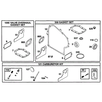 This is an OEM replacement carburetor overhaul kit. It can be used with select models of lawn and garden equipment engines. The carburetor is one of the most important parts of the engine. It is responsible for creating and circulating the air/fuel mixture that is used to initiate combustion in the engine. Over time, the carburetor's gaskets and parts can become worn, damaged, or brittle due to age, constant heat and vibrations, and exposure to chemicals in fuel. It is easy and more affordable to rebuild and replace gaskets than to buy a new unit. This genuine OEM carburetor overhaul kit is manufactured by Briggs & Stratton to exact standards. It is compatible with select engines from the brand, as well as certain models from Toro. This overhaul kit includes all of the necessary diaphragms, gaskets, and parts to rebuild the carburetor and is sold as an individual kit. A screwdriver and pliers will be required for replacement of the carburetor parts. Be sure to replace gaskets one at a time to avoid confusion and keep the equipment in the correct functioning condition. Clean the areas where gaskets are seated to ensure a proper seal and always work in a well-ventilated area when performing engine repairs.