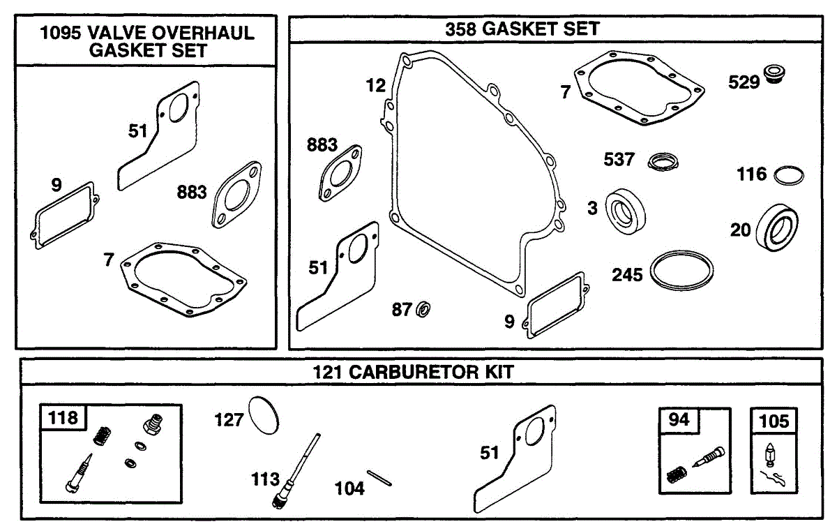 This is an OEM replacement carburetor overhaul kit. It can be used with select models of lawn and garden equipment engines. The carburetor is one of the most important parts of the engine. It is responsible for creating and circulating the air/fuel mixture that is used to initiate combustion in the engine. Over time, the carburetor's gaskets and parts can become worn, damaged, or brittle due to age, constant heat and vibrations, and exposure to chemicals in fuel. It is easy and more affordable to rebuild and replace gaskets than to buy a new unit. This genuine OEM carburetor overhaul kit is manufactured by Briggs & Stratton to exact standards. It is compatible with select engines from the brand, as well as certain models from Toro. This overhaul kit includes all of the necessary diaphragms, gaskets, and parts to rebuild the carburetor and is sold as an individual kit. A screwdriver and pliers will be required for replacement of the carburetor parts. Be sure to replace gaskets one at a time to avoid confusion and keep the equipment in the correct functioning condition. Clean the areas where gaskets are seated to ensure a proper seal and always work in a well-ventilated area when performing engine repairs.
