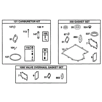 This is an OEM replacement carburetor overhaul kit. It can be used with select models of lawn and garden equipment engines. The carburetor is one of the most important parts of the engine. It is responsible for creating and circulating the air/fuel mixture that is used to initiate combustion in the engine. Over time, the carburetor's gaskets and parts can become worn, damaged, or brittle due to age, constant heat and vibrations, and exposure to chemicals in fuel. It is easy and more affordable to rebuild and replace gaskets than to buy a new unit. This genuine OEM carburetor overhaul kit is manufactured by Briggs & Stratton to exact standards. It is compatible with select engines from the brand, as well as certain models from Toro. This overhaul kit includes all of the necessary diaphragms, gaskets, and parts to rebuild the carburetor and is sold as an individual kit. A screwdriver and pliers will be required for replacement of the carburetor parts. Be sure to replace gaskets one at a time to avoid confusion and keep the equipment in the correct functioning condition. Clean the areas where gaskets are seated to ensure a proper seal and always work in a well-ventilated area when performing engine repairs.