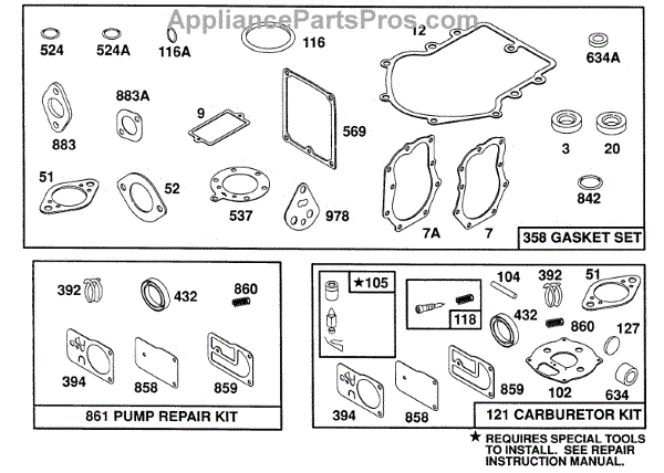 This fuel pump kit is made for use with lawn and garden equipment with small engines. The kit comes with all the diaphragms, gaskets, and additional parts needed to completely rebuild a fuel pump. It may be required if the lawn tool has fuel pump issues such as sluggish performance, leaks, and other problems. It can be used to fix the most common issues related to worn out diaphragms and gaskets.The fuel pump in lawn and garden equipment is a component that helps bring fuel from the tank to the engine when the carburetor is mounted at a lower position than the carburetor. With these kit parts, many issues with the fuel pump can be alleviated. Replacement requires a nut drive, a wrench set, and a socket set. The fuel pump will need to be disassembled to replace the parts that are not working correctly.This fuel pump kit is a genuine OEM replacement part sourced directly from the manufacturer. It's sold as an individual kit. The kit is designed to be used in lawnmowers and snowblowers manufactured by MasterCut, Briggs & Stratton, Craftsman, Simplicity, Toro, and Cub Cadet.