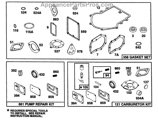 This fuel pump kit is made for use with lawn and garden equipment with small engines. The kit comes with all the diaphragms, gaskets, and additional parts needed to completely rebuild a fuel pump. It may be required if the lawn tool has fuel pump issues such as sluggish performance, leaks, and other problems. It can be used to fix the most common issues related to worn out diaphragms and gaskets.The fuel pump in lawn and garden equipment is a component that helps bring fuel from the tank to the engine when the carburetor is mounted at a lower position than the carburetor. With these kit parts, many issues with the fuel pump can be alleviated. Replacement requires a nut drive, a wrench set, and a socket set. The fuel pump will need to be disassembled to replace the parts that are not working correctly.This fuel pump kit is a genuine OEM replacement part sourced directly from the manufacturer. It's sold as an individual kit. The kit is designed to be used in lawnmowers and snowblowers manufactured by MasterCut, Briggs & Stratton, Craftsman, Simplicity, Toro, and Cub Cadet.