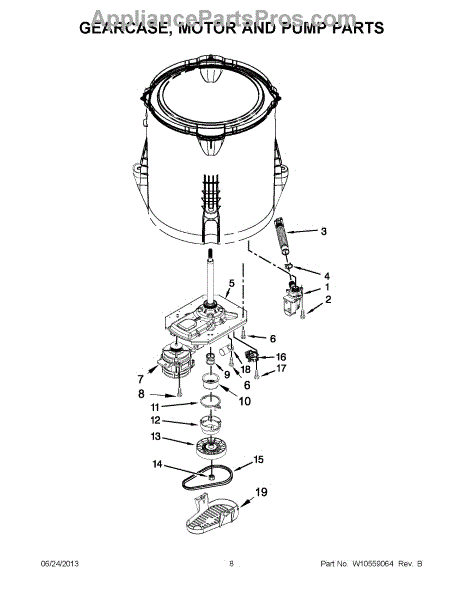 This is a washing machine gearcase. The purpose of the gearcase is to drive the agitator and spin the basket within the washing machine. When the gearcase stops working correctly, the water may not drain from the clothing after the spin cycle. The user may also notice a burning odor that comes from the washing machine while it's in operation. Sometimes, the washing machine will attempt to agitate and run the spin cycle at the same time. If this is the case, the gearcase needs to be replaced. The appliance will need to be unplugged before replacing this part. Wear gloves to protect the hands for this process.This component is compatible with washing machines that are manufactured by Whirlpool, Kenmore, and Maytag. It is sold individually. This is a genuine OEM replacement part that comes straight from the manufacturer. It's high quality and made to last.