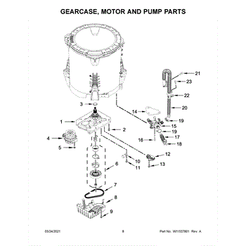 The Transmission Gearcase is an OEM part for Whirlpool top-load washing machines. It houses the transmission components that control the spin speed via the motor during the extract cycle. Properly functioning gears are essential for removing water through centrifuge action.