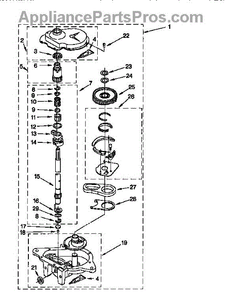 Supports the washer transmission shaft to reduce axial wear and noise. Replace when you hear grinding sounds or experience rough operation. Confirm fit with your model number.