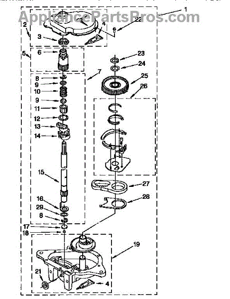 Supports the washer transmission shaft to reduce axial wear and noise. Replace when you hear grinding sounds or experience rough operation. Confirm fit with your model number.