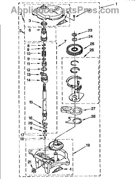 Supports the washer transmission shaft to reduce axial wear and noise. Replace when you hear grinding sounds or experience rough operation. Confirm fit with your model number.