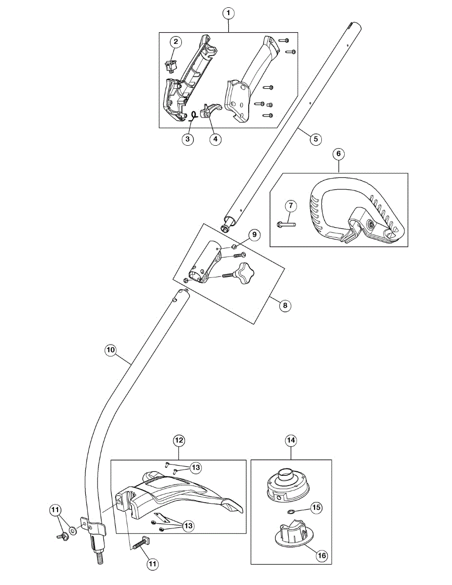 Handle assembly for gas line trimmers. Installs on the shaft to provide grip and control. Replace if cracked, broken, or worn from regular use.