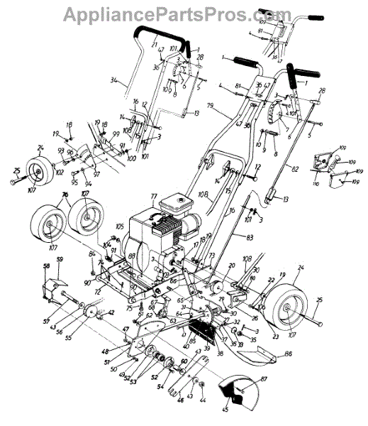 This is the front wheel assembly that is used by a large number of manufactures as the standard wheel for push mowers. This wheel is a tough, black rubber wheel fitted onto a sturdy white chassis. Since it is not a pneumatic wheel, there is no concern that it will roll over hidden debris and be damaged. Push wheels such as these often last the lifetime of a Lawn Mower. However, there are occasions when the housing of the mower is dropped and the wheel becomes warped or broken. It's also the case that, with constant use, the wheels can lose tread, making them harder to maneuver in tough mowing conditions. It has also been reported that the tires will wear and become smaller in circumference over time, meaning it will require more gasoline to mow the same amount of yard. The front wheels are easily replaced. After removing the plug cap and stabilizing the mower, simply use a socket wrench to remove the center bolt from the wheel. It's a good idea to use a dry lubricant like graphite on the axle before replacing it. This OEM guaranteed replacement part is compatible with Ryobi, Yard Machines, Troy-Bilt, Cub Cadet, Husky, Yard-Man, and MTD push mowers.