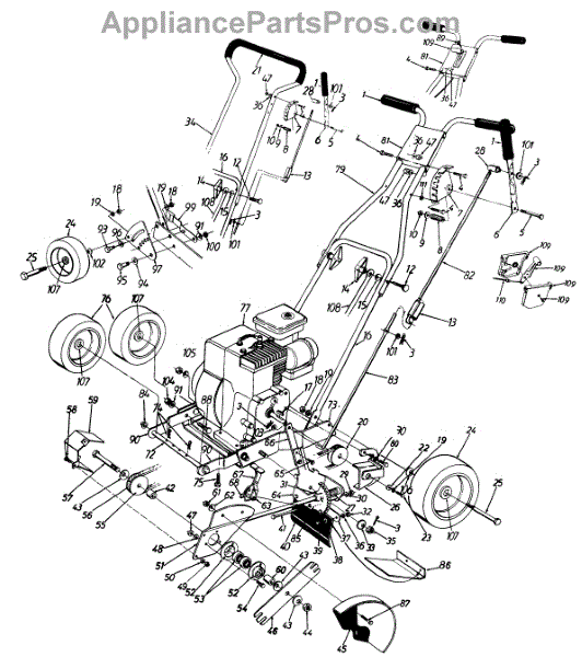 This is the front wheel assembly that is used by a large number of manufactures as the standard wheel for push mowers. This wheel is a tough, black rubber wheel fitted onto a sturdy white chassis. Since it is not a pneumatic wheel, there is no concern that it will roll over hidden debris and be damaged. Push wheels such as these often last the lifetime of a Lawn Mower. However, there are occasions when the housing of the mower is dropped and the wheel becomes warped or broken. It's also the case that, with constant use, the wheels can lose tread, making them harder to maneuver in tough mowing conditions. It has also been reported that the tires will wear and become smaller in circumference over time, meaning it will require more gasoline to mow the same amount of yard. The front wheels are easily replaced. After removing the plug cap and stabilizing the mower, simply use a socket wrench to remove the center bolt from the wheel. It's a good idea to use a dry lubricant like graphite on the axle before replacing it. This OEM guaranteed replacement part is compatible with Ryobi, Yard Machines, Troy-Bilt, Cub Cadet, Husky, Yard-Man, and MTD push mowers.