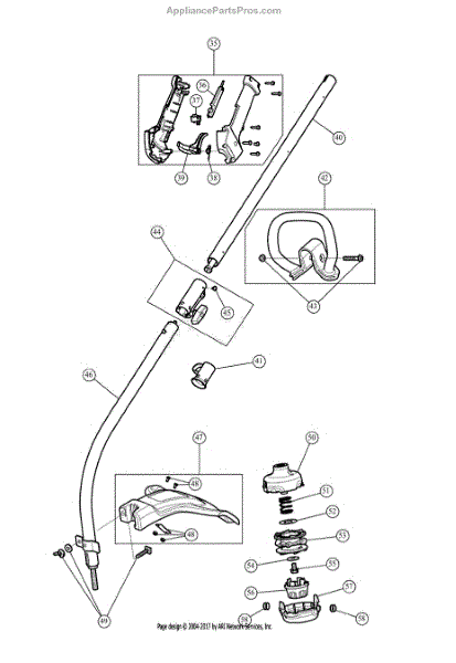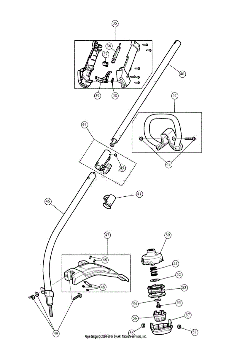 Upper boom assembly for gas line trimmers. Connects the engine housing to the cutting head. Replace if cracked, bent, or structurally damaged.